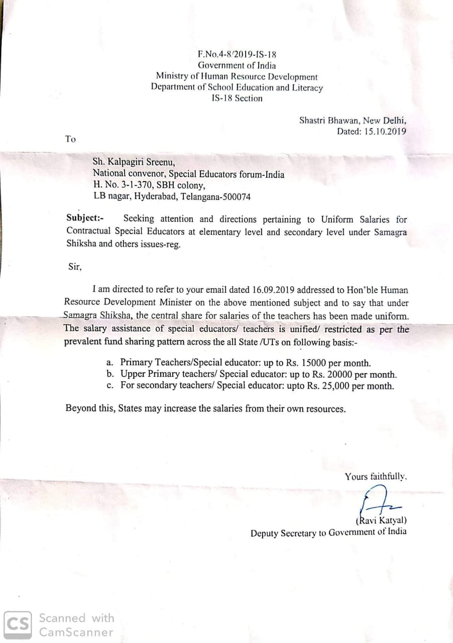 seeking attention and directions pertaining to uniform salaries for contractual special educators at elementary level and secondary level under samagra shiksha and others issues-reg.