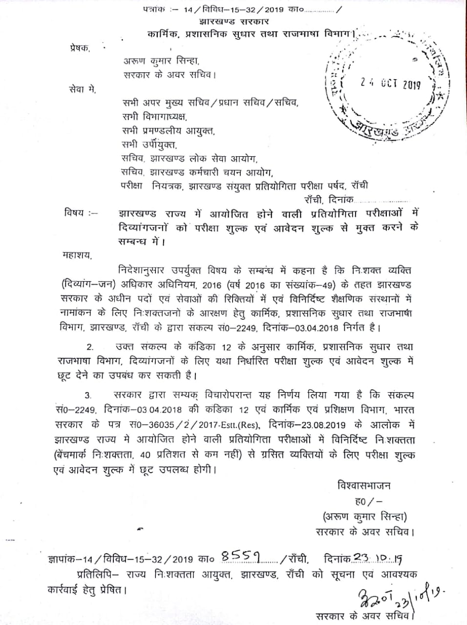 झारखंड राज्य में आयोजित होने वाली प्रतियोगिताओं में दिव्यांगजनों को परीक्षा शुल्क एवं आवेदन शुल्क में मुफ्त करने के संबंध में।