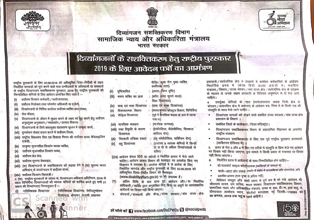 Invitation/Information- Applications for National Award, 2019 for PwD