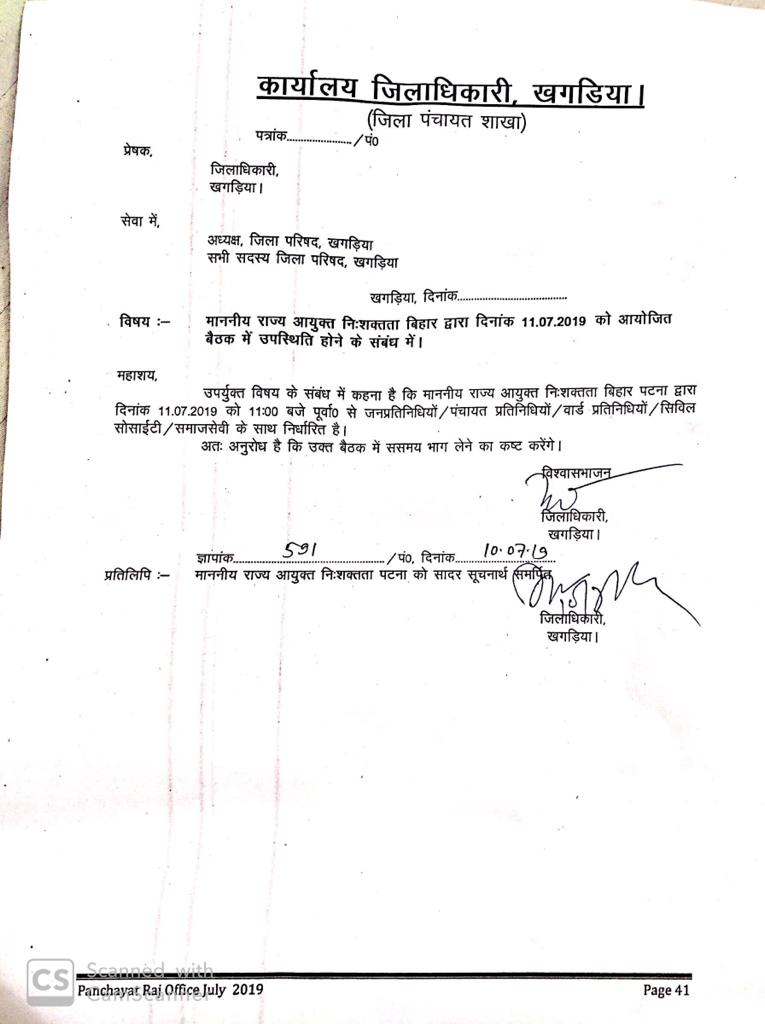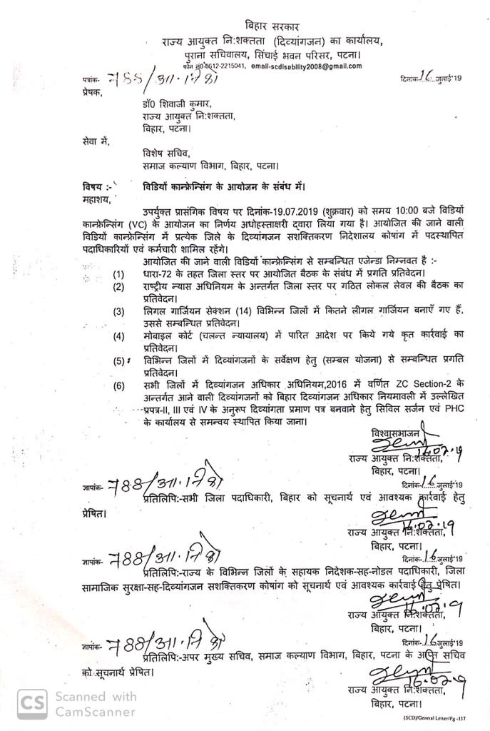 माननीय राज्य आयुक्त निःशक्तता, बिहार द्वारा दिनांक-11.07.2019 को आयोजित बैठक में उपस्थिति होने के संबंध में।
