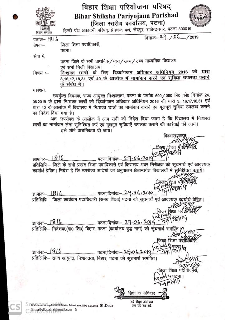 निःशक्त छात्रों के लिए दिव्यांगजन अधिकार अधिनियम, 2016 की धारा 3,16,17,18,31 एवं 40 के आलोक में नामांकन करने एवं सूविधा उपलब्ध कराने के संबंध में।