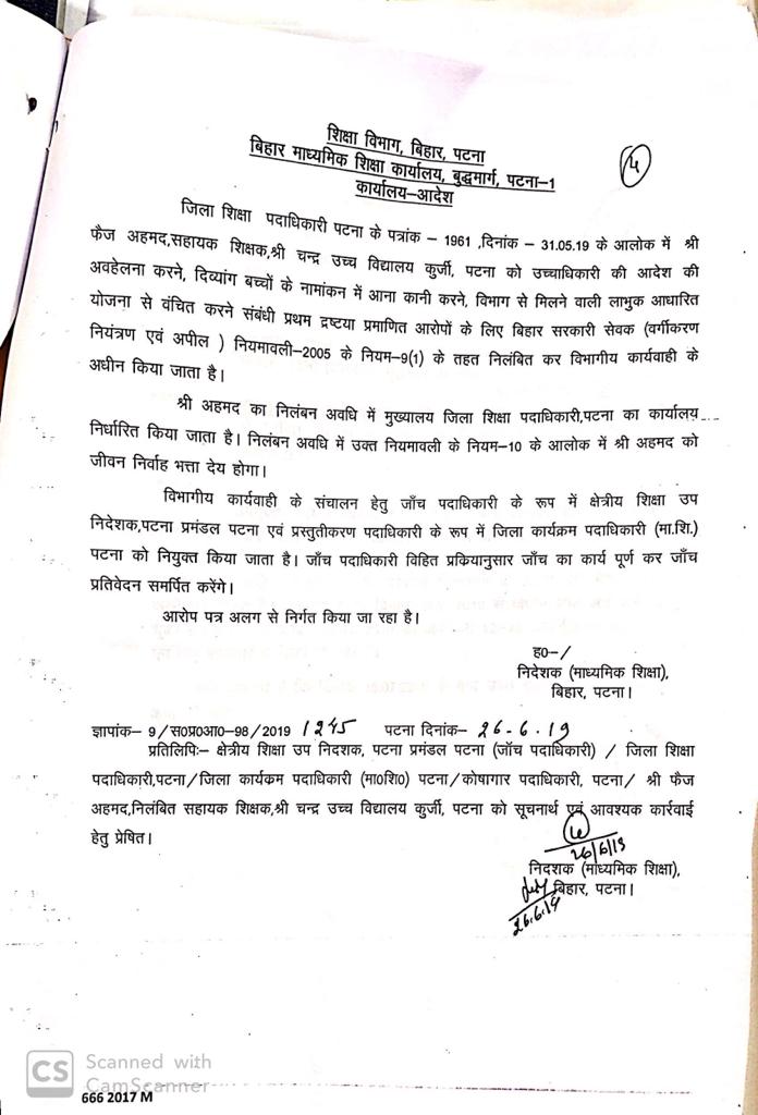 दिनांक-31.05.19 के आलोक में श्री फैज अहमद, सहायक शिक्षक, श्री चन्द्र उच्च विद्यालय, कुर्जी, पटना को उच्चाधिकारी की आदेश की अवहेलना करने के संबंध में।