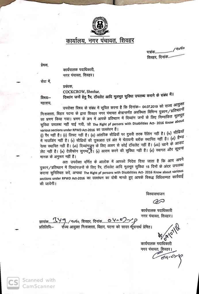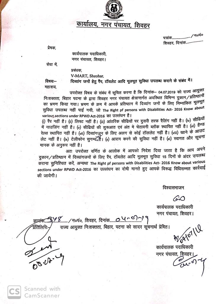 शिवहर नगर पंचायत में दिव्यांगजनों हेतु रैंप,टाॅयलेट आदि मूलभूत सुविधा उपलब्ध कराने के संबंध में।