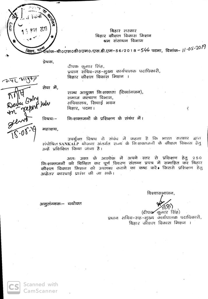 आमन्त्रण / सूचना : बिहार के दिव्यांगजन को सूचित किया जाता है की अगर वे 18 वर्ष के ऊपर आयू वर्ग के हैं एवं कौशल विकास एवं रोजगार से जुड़ना चाह रहें है तो भारत सरकार की - संकल्प योजना अंतर्गत - बिहार सरकार - श्रम संसाधन विभाग - बिहार कौशल विकास मिशन के अंतर्गत - आप ट्रेनिंग कर रोजगार से जुर सकते है इसके लिए आप अपना बायो डाटा - हमें ईमेल कर सकते है - scdisability2008@gmail.com या website : www.scdisabilities.org पर देख सकते हैं