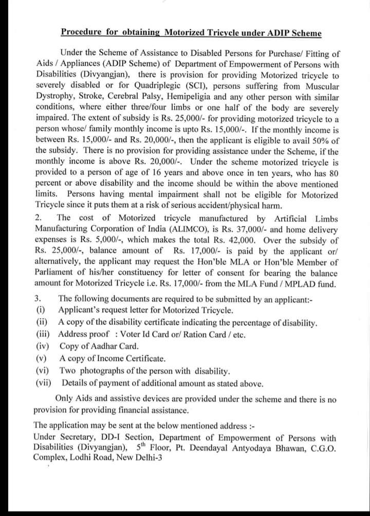 ए.डी.आई.पी योजना के तहत मोटराइज्ड ट्राइसाइकिल प्राप्त करने की प्रक्रिया।